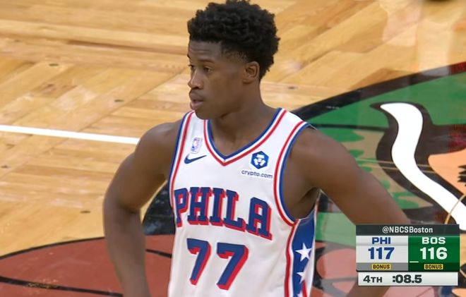 關(guān)鍵對(duì)面凱爾特人沒(méi)有塔圖姆,你面對(duì)的是沒(méi)有波神,沒(méi)有霍福德的凱爾特人,中鋒是蒂爾曼你在那哐哐投,你連他都打不了,那全聯(lián)盟就沒(méi)有你能打得過(guò)的內(nèi)線了。此時(shí)不得不提到一個(gè)人,費(fèi)城76人剛選的新秀VJ-埃奇庫(kù)姆,他打了42分鐘拿了34+7+3。